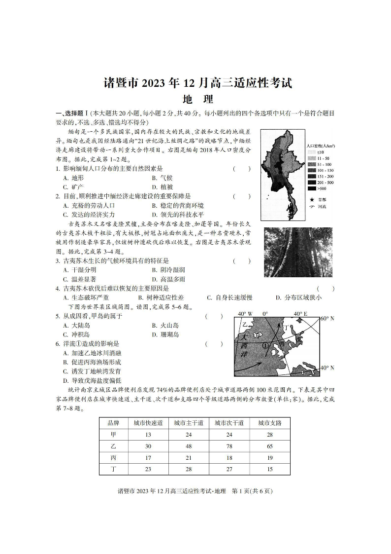 浙江省诸暨市2023年12月高三适应性考试 地理