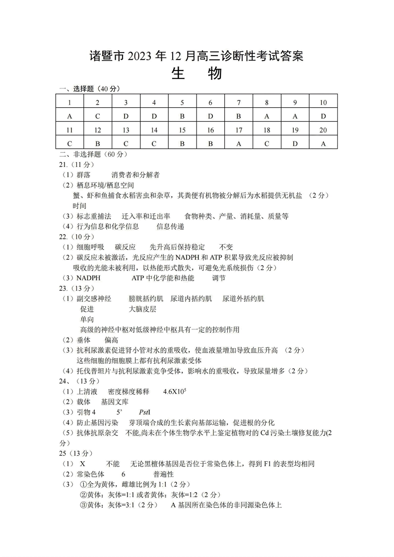 浙江省诸暨市2023年12月高三适应性考试 生物参考答案
