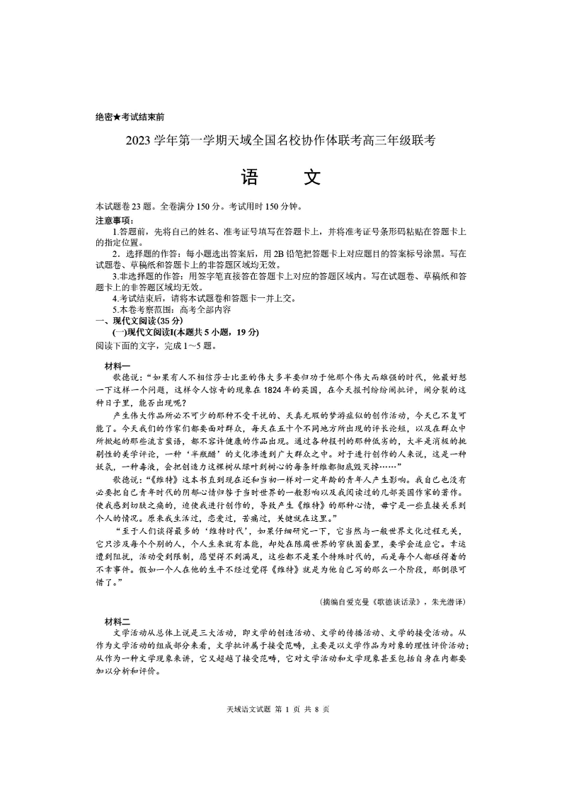 2023-2024学年第一学期天域全国名校协作体联考 语文