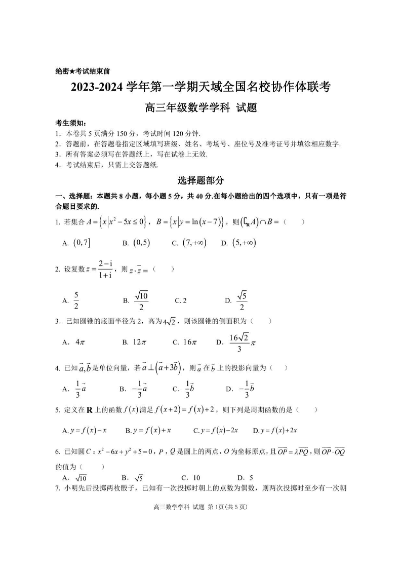 2023-2024学年第一学期天域全国名校协作体联考 数学