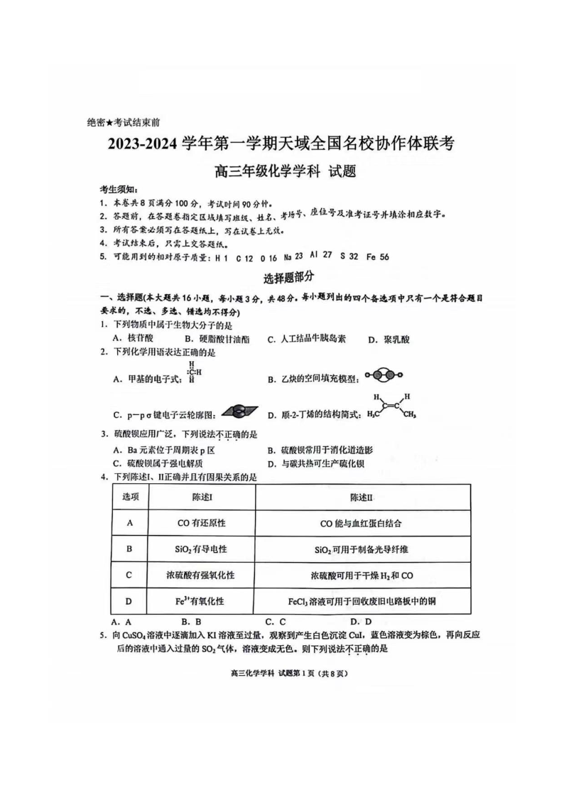 2023-2024学年第一学期天域全国名校协作体联考 化学