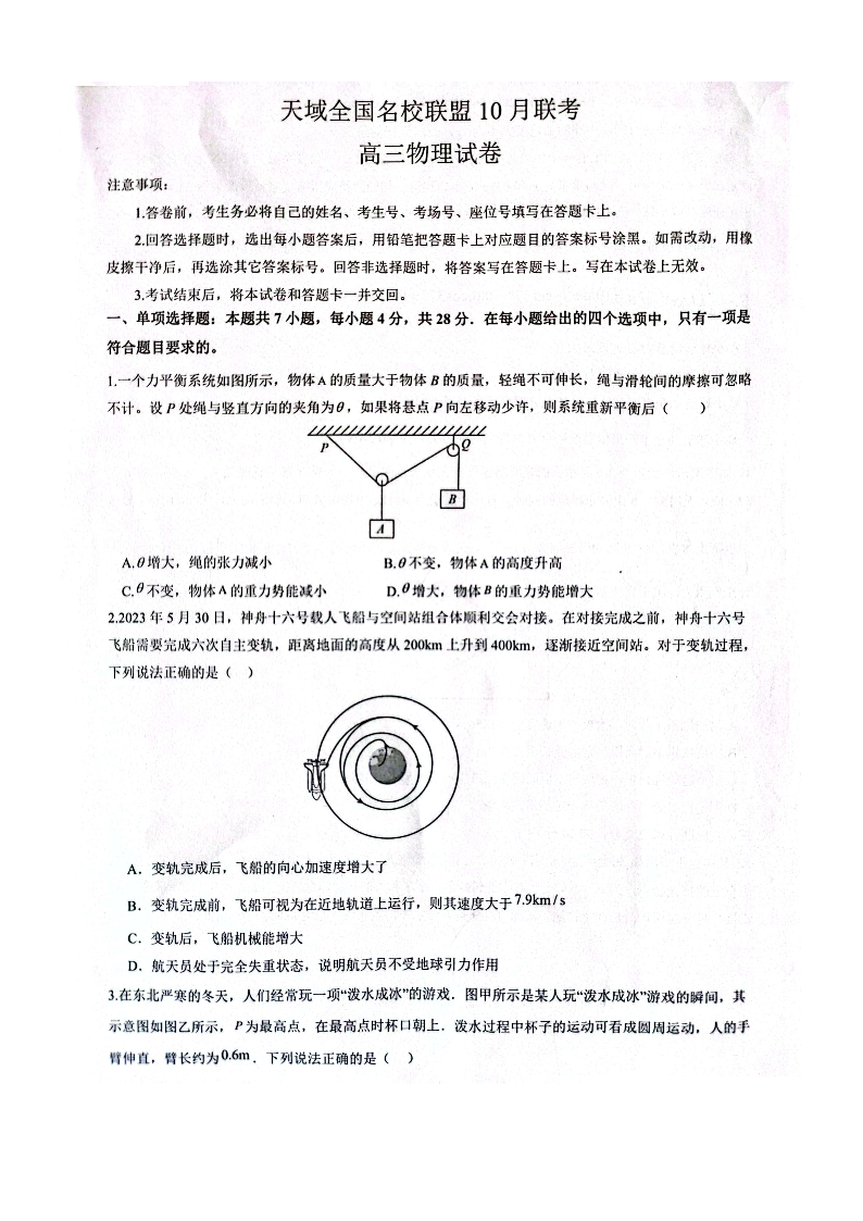 2023-2024学年第一学期天域全国名校协作体联考 物理