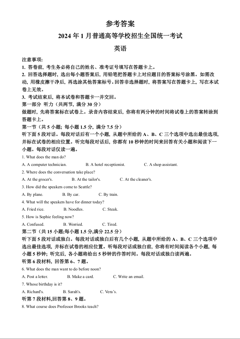 2024年1月浙江省普通高校招生选考科目考试 英语答案