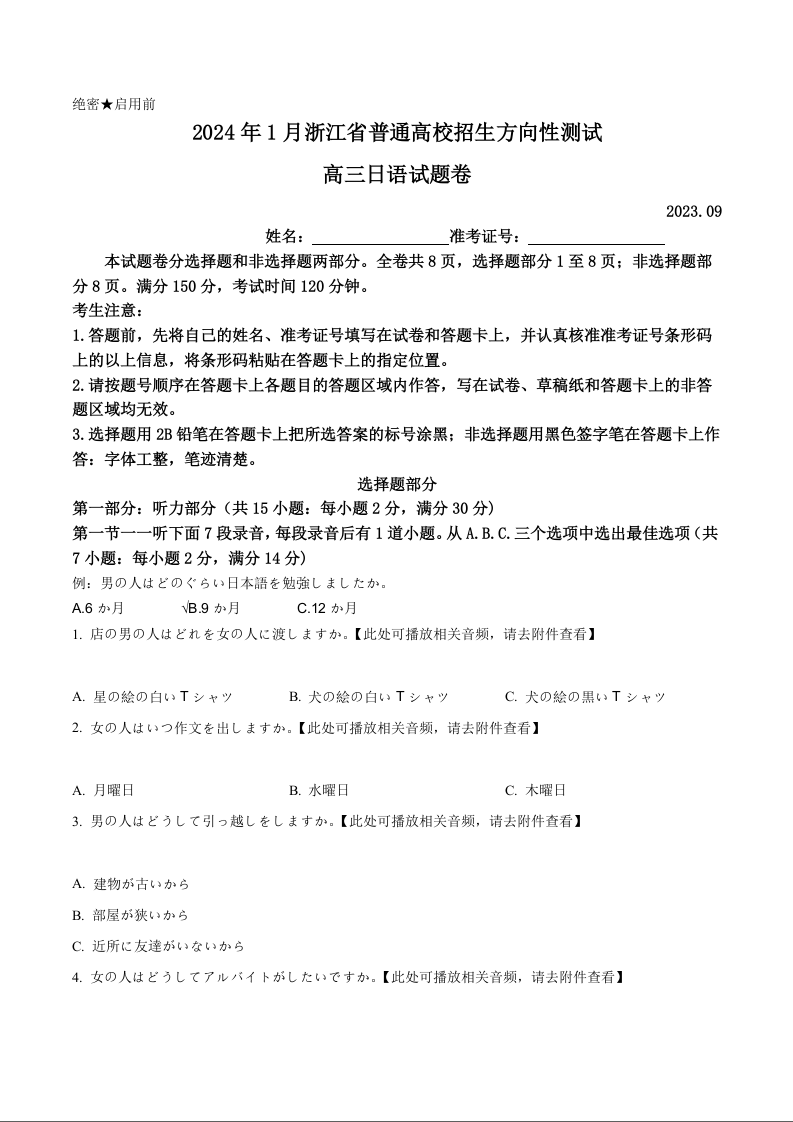 2024年1月浙江省普通高校招生选考科目考试 日语