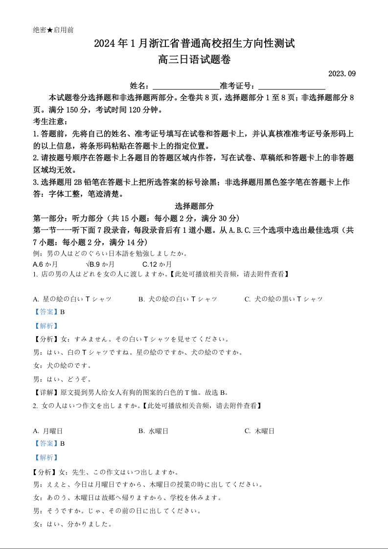 2024年1月浙江省普通高校招生选考科目考试 日语答案
