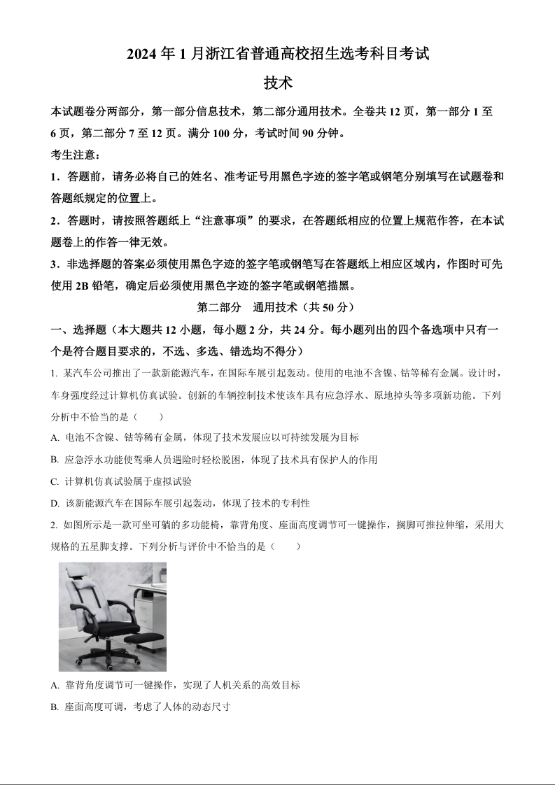 2024年1月浙江省普通高校招生选考科目考试 通用技术
