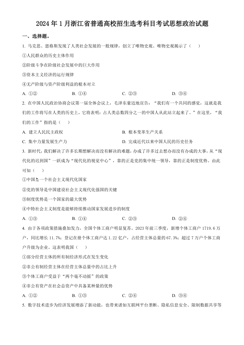 2024年1月浙江省普通高校招生选考科目考试 政治