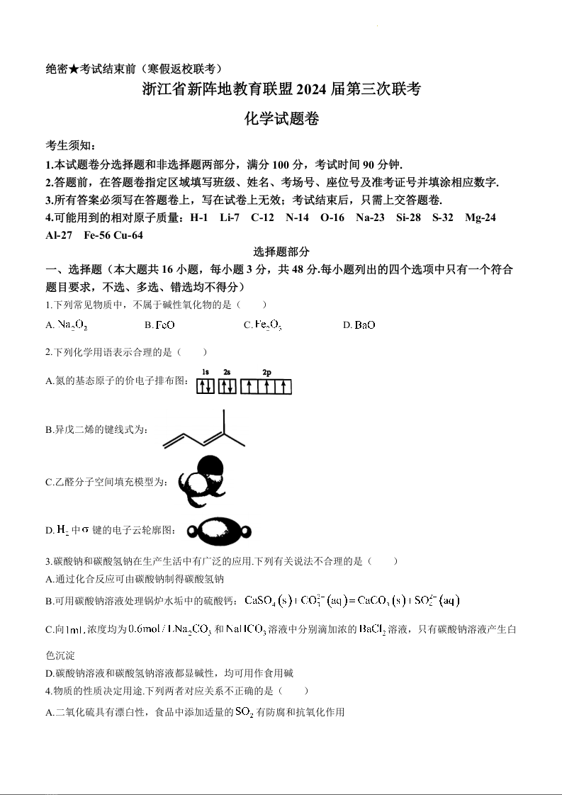 浙江省新阵地教育联盟2023-2024学年高三下学期开学考试 化学