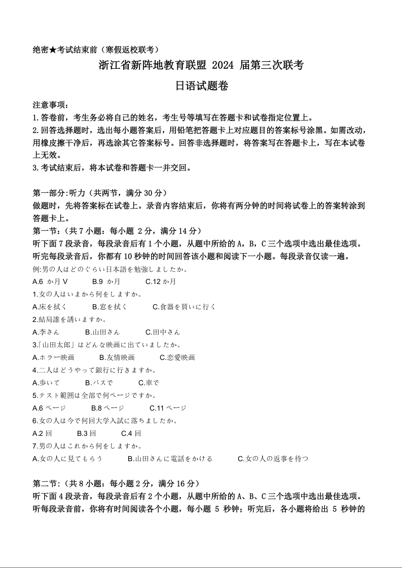 浙江省新阵地教育联盟2023-2024学年高三下学期开学考试 日语
