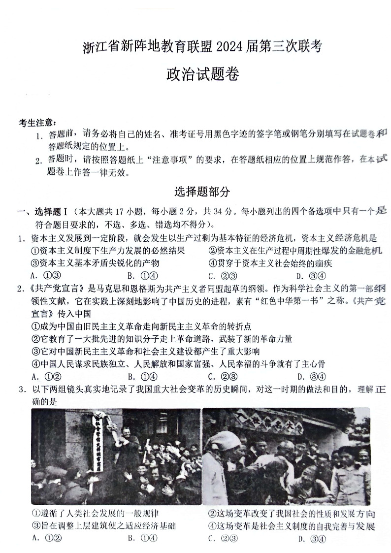 浙江省新阵地教育联盟2023-2024学年高三下学期开学考试 政治