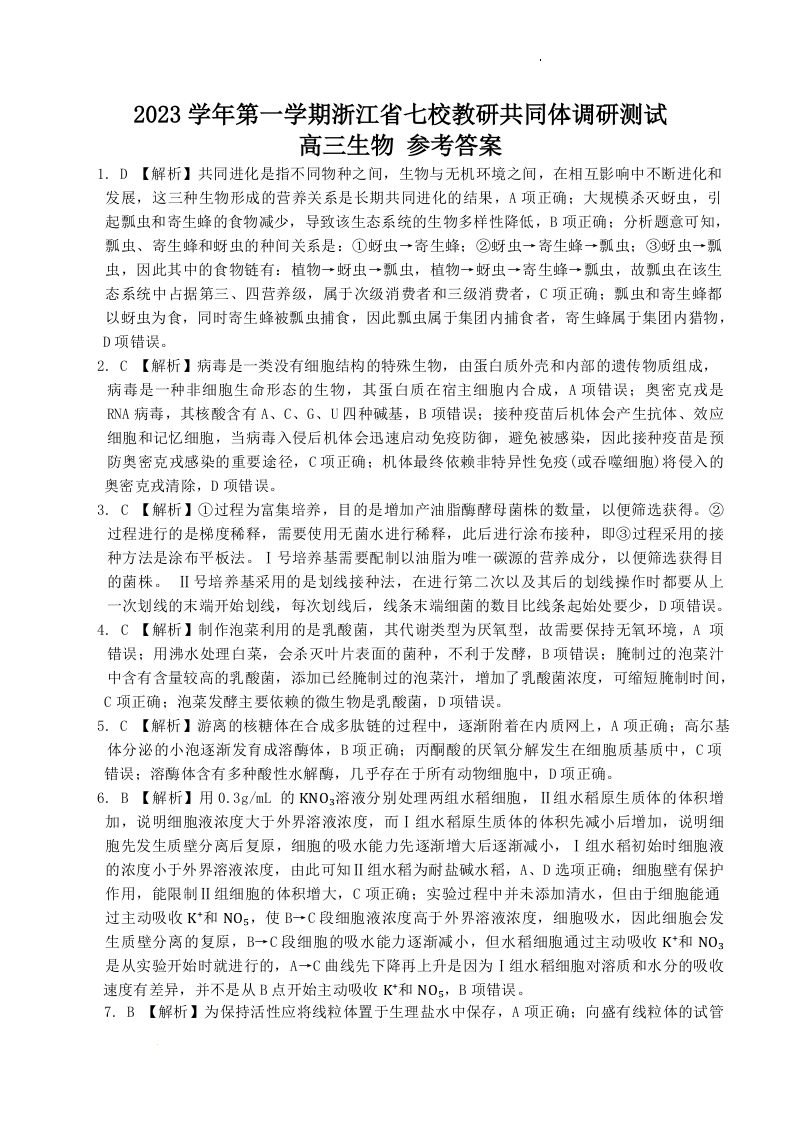 2023学年第一学期浙江省七校教研共同体调研测试 生物答案