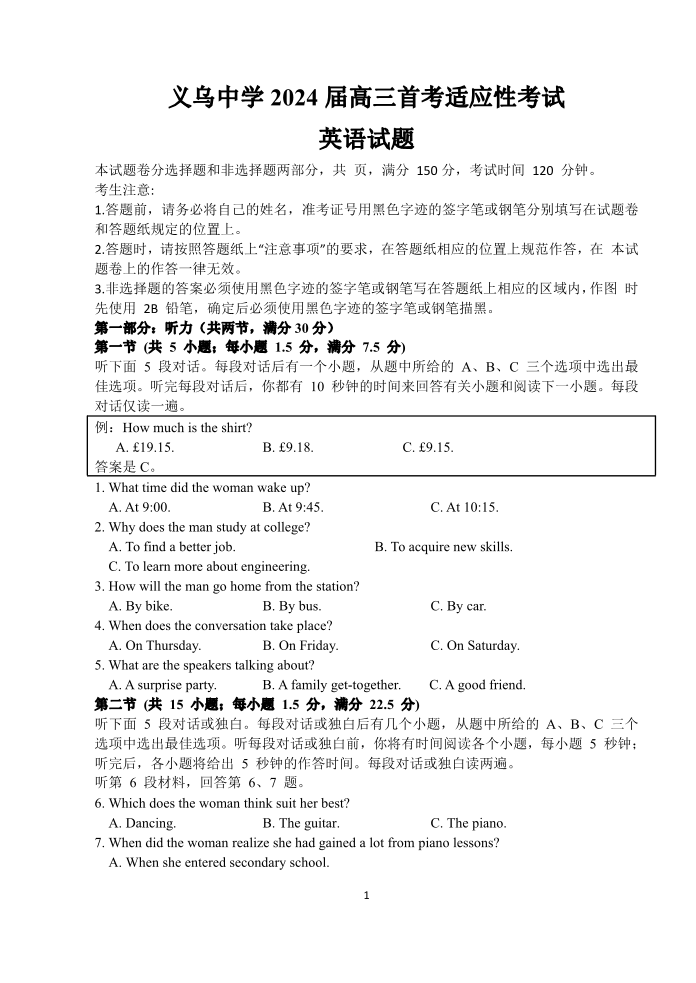 浙江省义乌中学2023-2024学年高三上学期首考适应性考试 英语