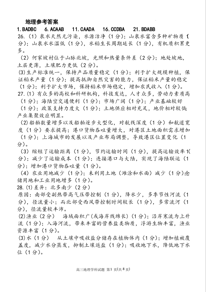 浙江省义乌中学2023-2024学年高三上学期首考适应性考试 地理答案
