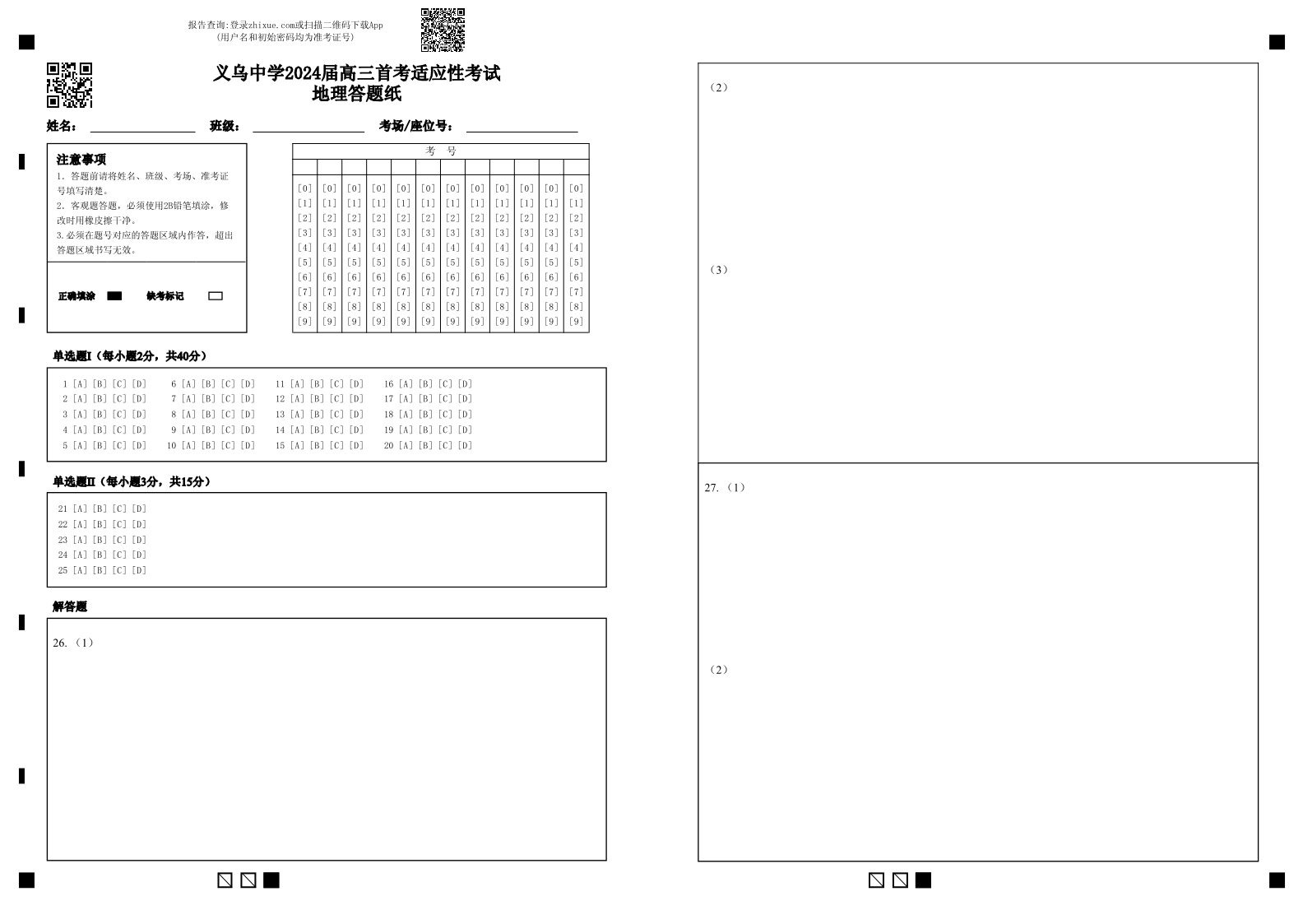 浙江省义乌中学2023-2024学年高三上学期首考适应性考试 地理答题纸