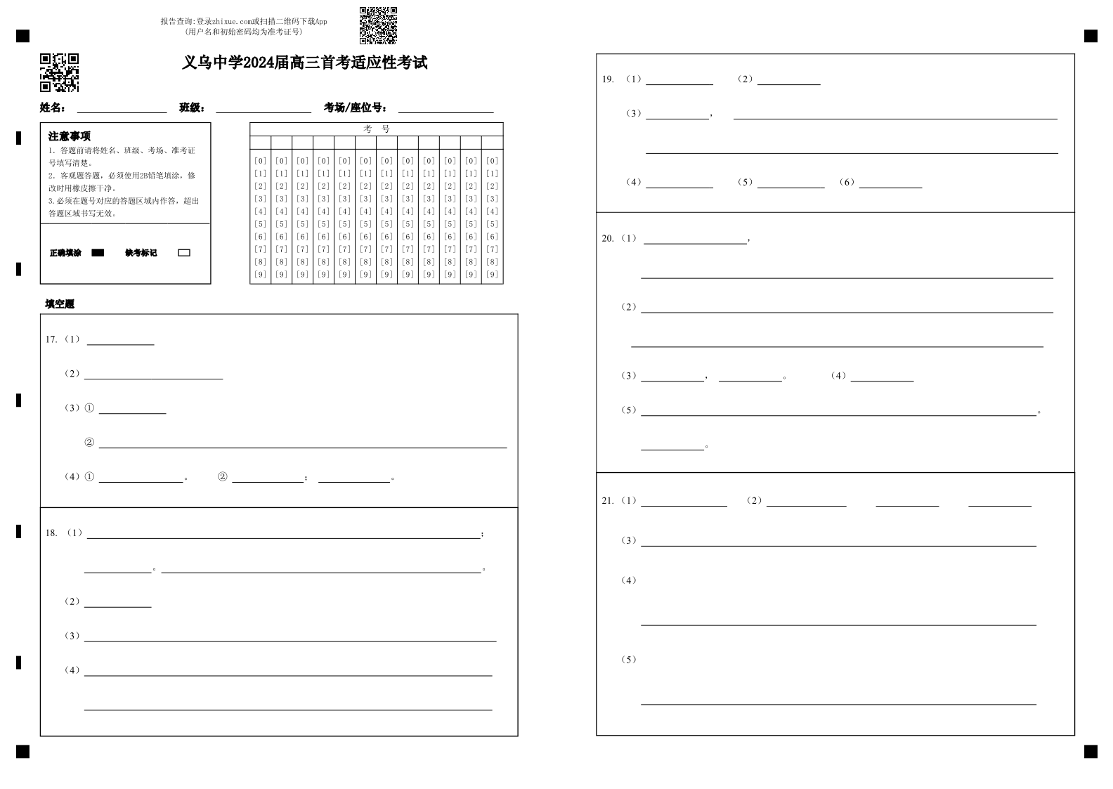 浙江省义乌中学2023-2024学年高三上学期首考适应性考试 化学答题卷