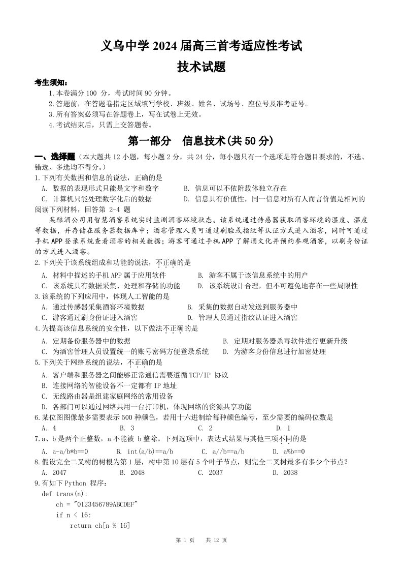 浙江省义乌中学2023-2024学年高三上学期首考适应性考试 技术