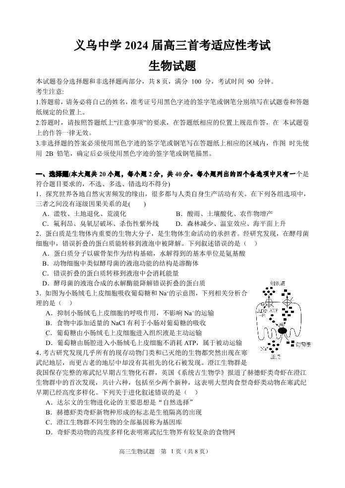 浙江省义乌中学2023-2024学年高三上学期首考适应性考试 生物