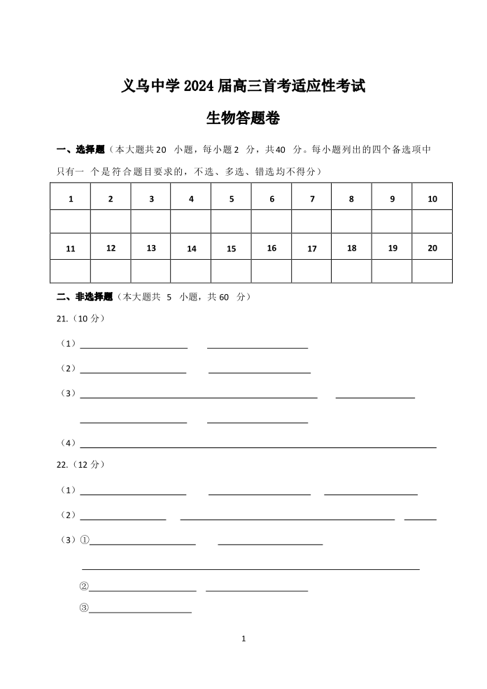 浙江省义乌中学2023-2024学年高三上学期首考适应性考试 生物答题纸