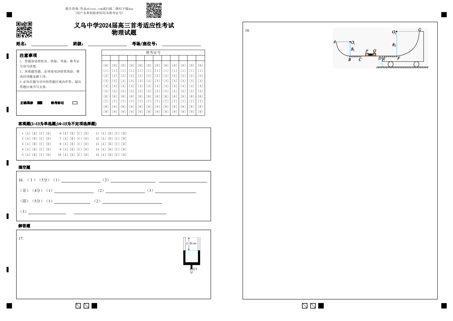 浙江省义乌中学2023-2024学年高三上学期首考适应性考试 物理答题卷