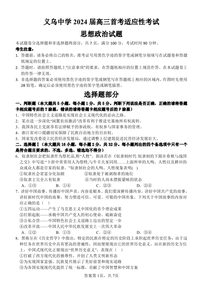浙江省义乌中学2023-2024学年高三上学期首考适应性考试 政治