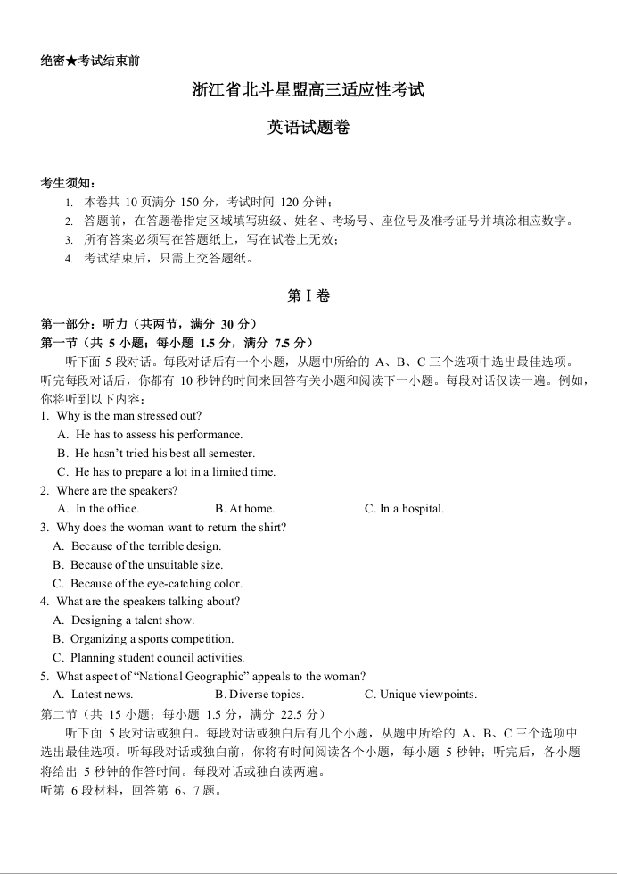 浙江省北斗星盟2023-2024学年高三上学期12月适应性考试 英语
