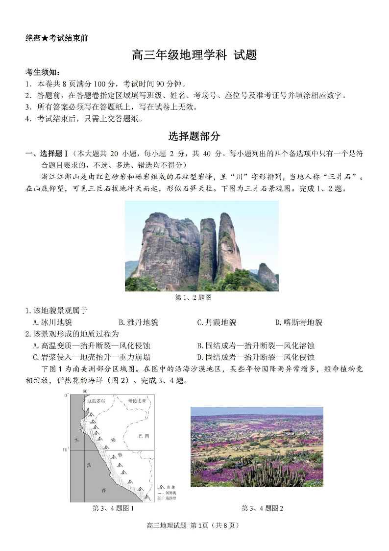 浙江省北斗星盟2023-2024学年高三上学期12月适应性考试 地理