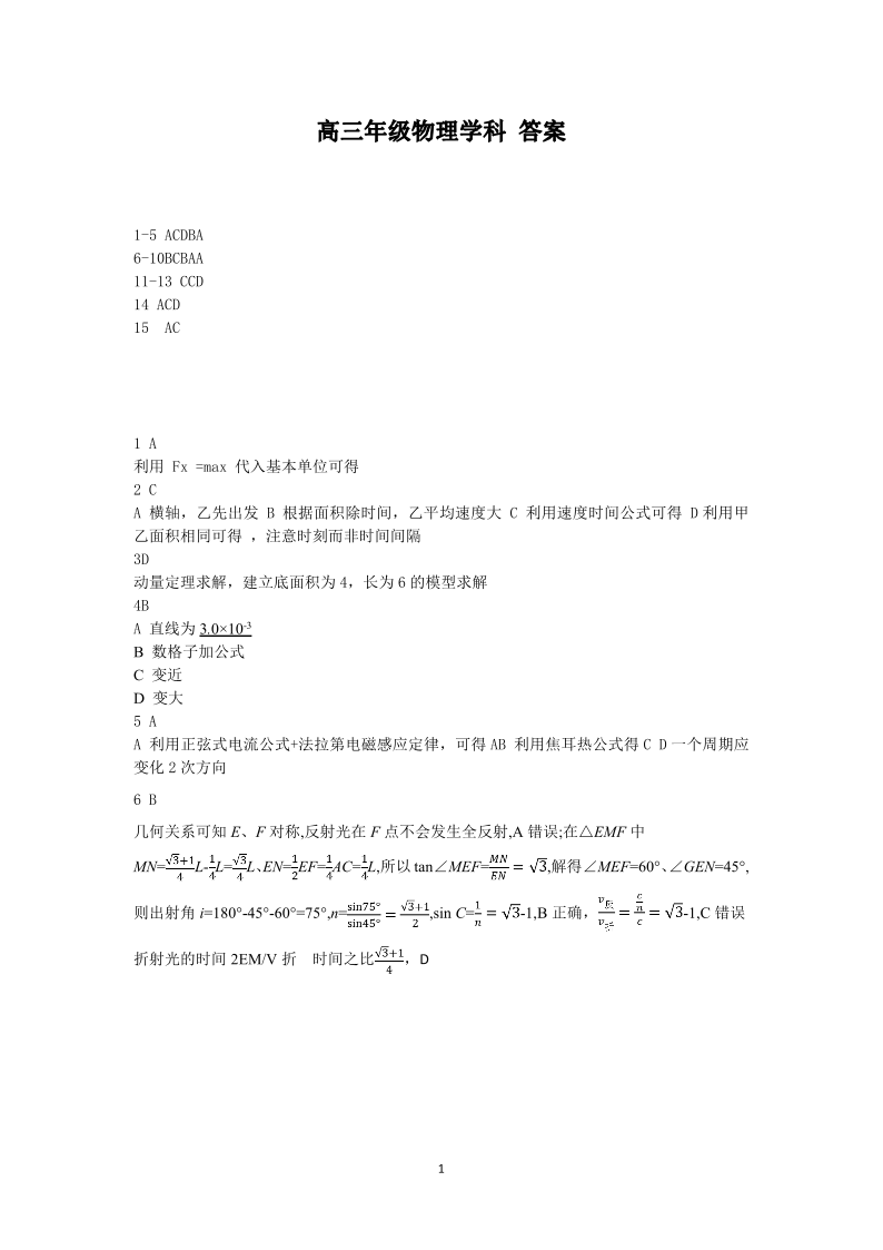 浙江省北斗星盟2023-2024学年高三上学期12月适应性考试 物理答案