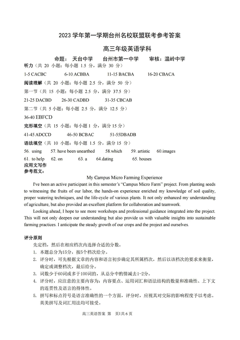 浙江省台州名校联盟2023-2024学年高三上学期联考 英语答案