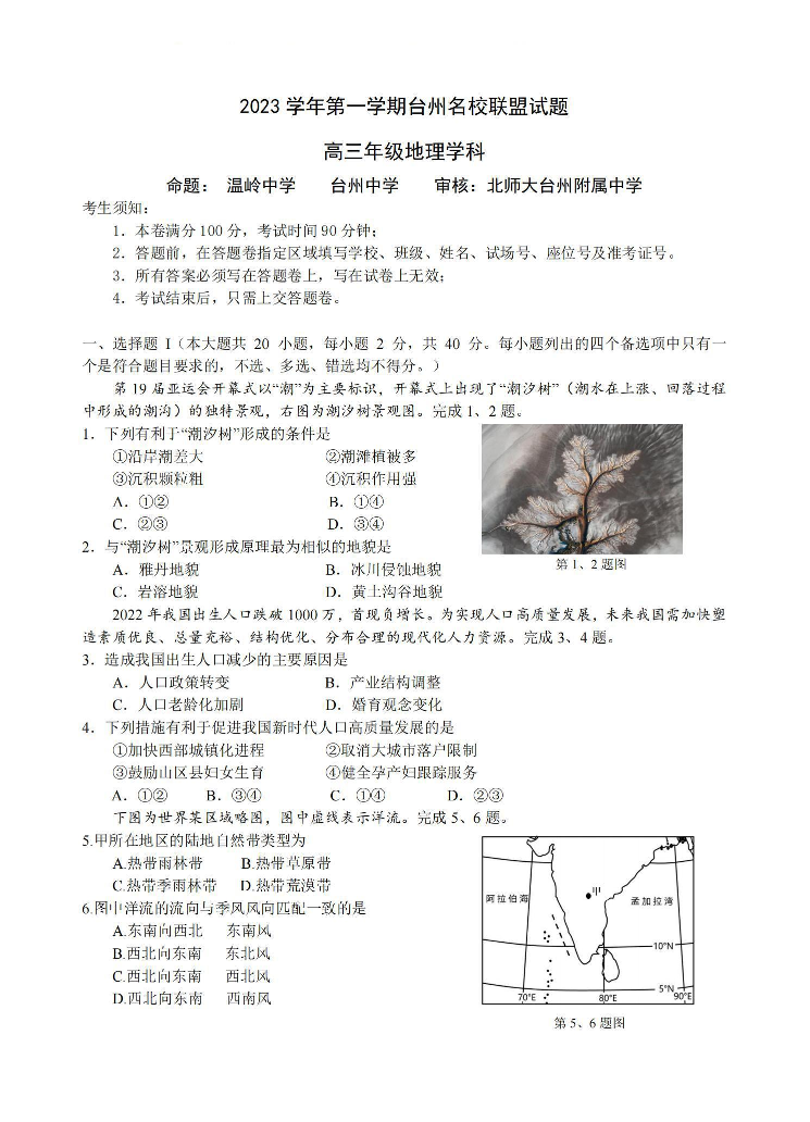 浙江省台州名校联盟2023-2024学年高三上学期联考 地理