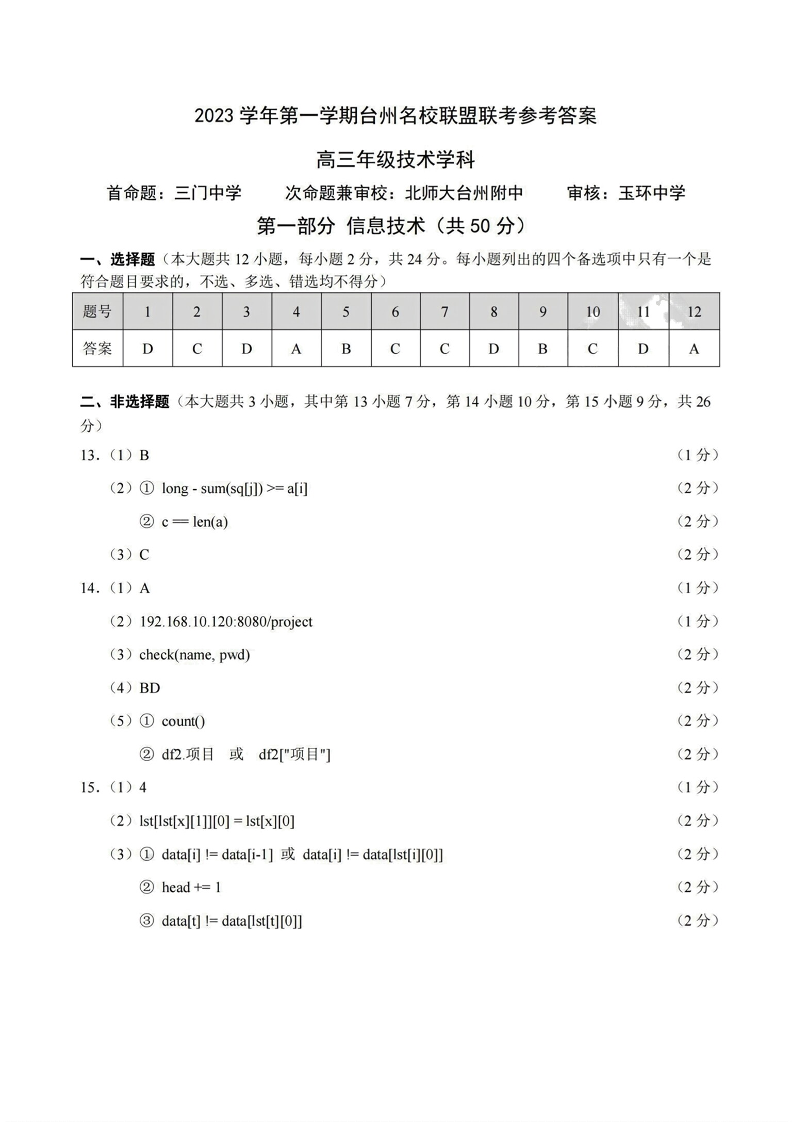 浙江省台州名校联盟2023-2024学年高三上学期联考 技术答案