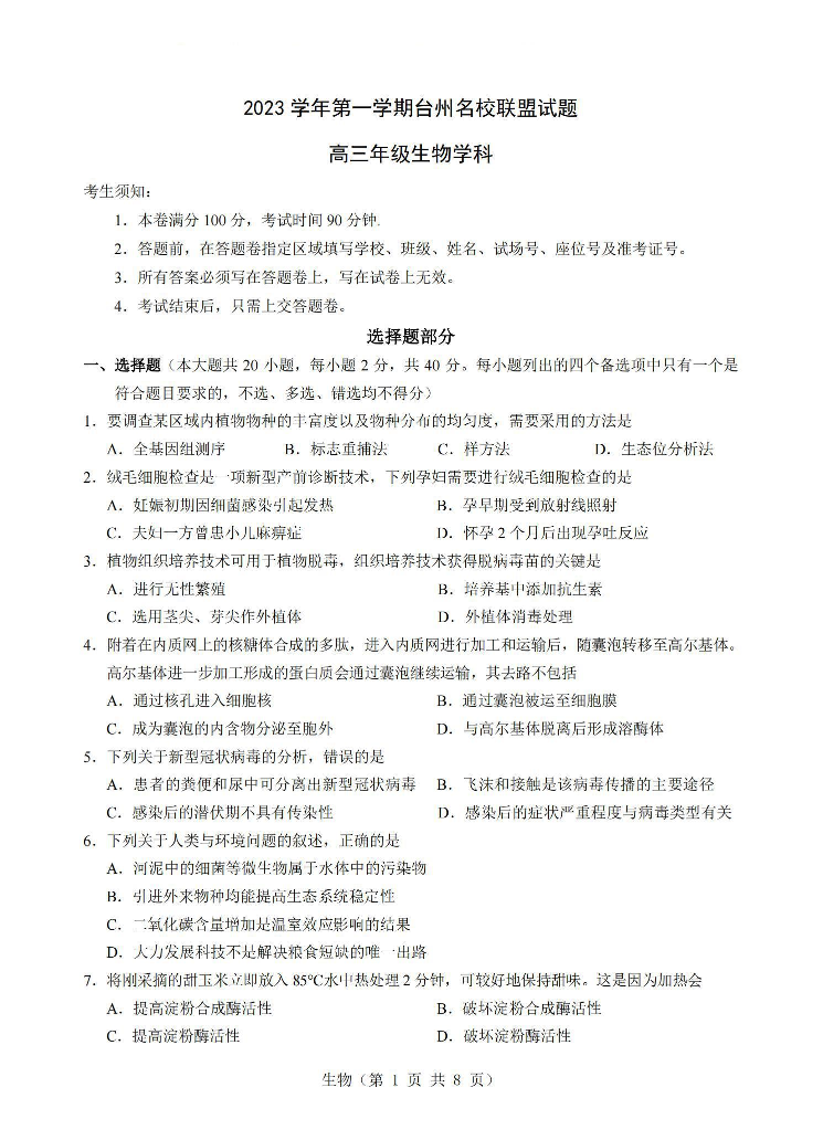 浙江省台州名校联盟2023-2024学年高三上学期联考 生物