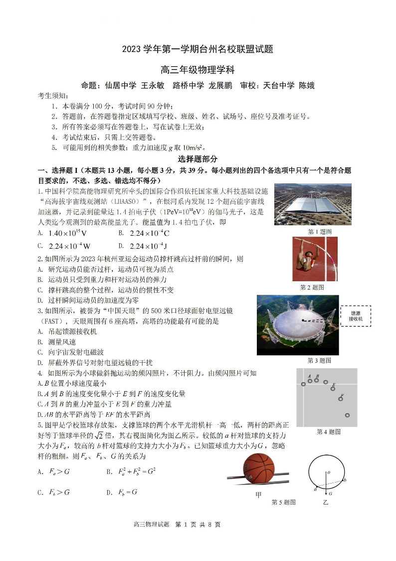 浙江省台州名校联盟2023-2024学年高三上学期联考 物理