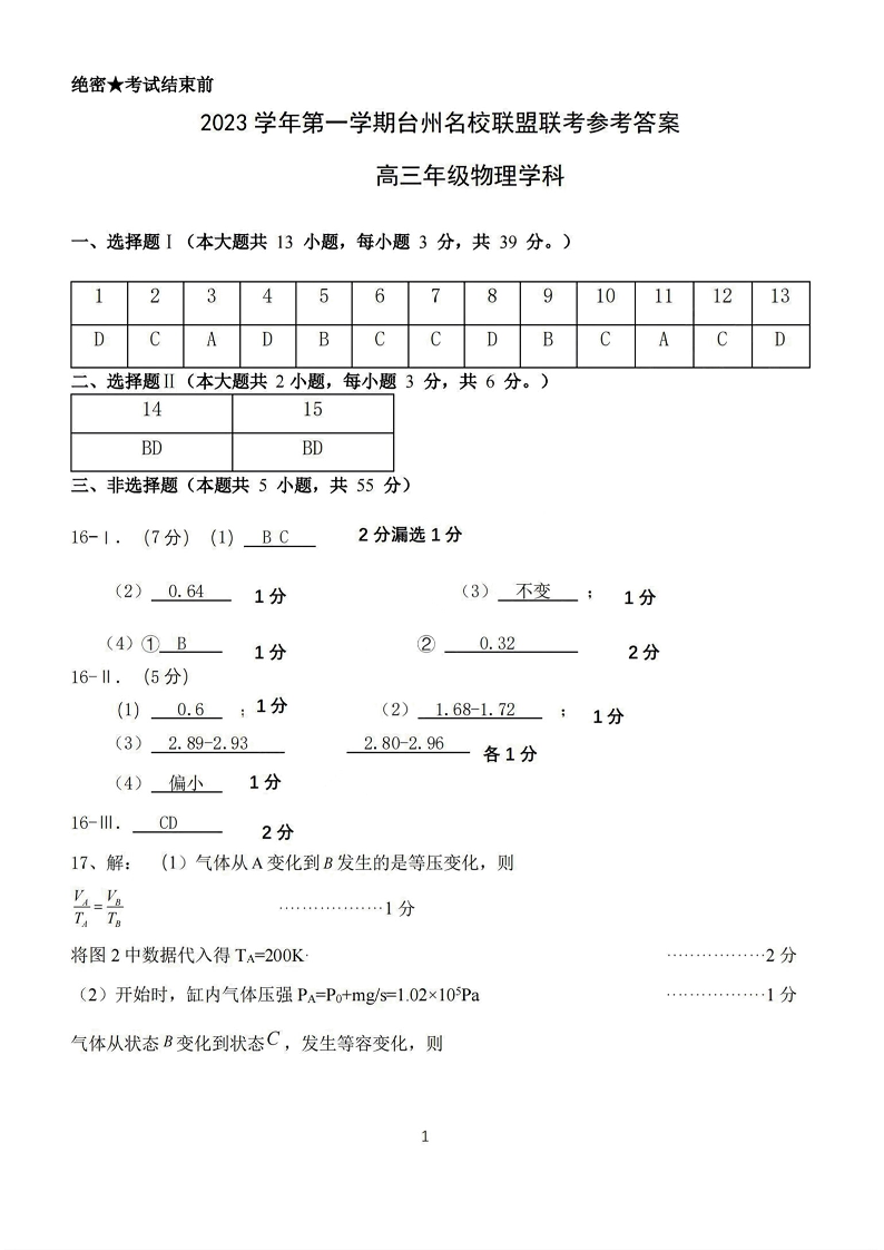 浙江省台州名校联盟2023-2024学年高三上学期联考 物理答案