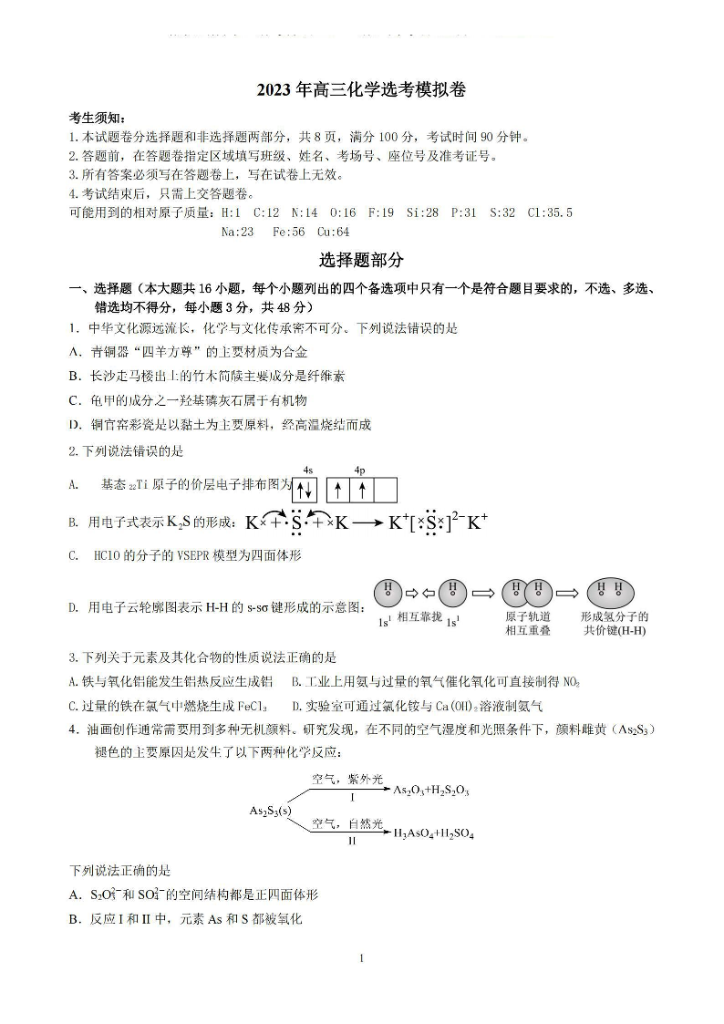 浙江省三校2023-2024学年高三上学期联考选考模拟 化学