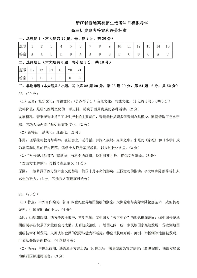 浙江省三校2023-2024学年高三上学期联考选考模拟 历史答案