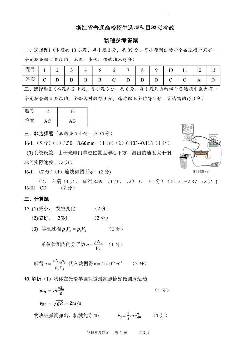 浙江省三校2023-2024学年高三上学期联考选考模拟 物理答案