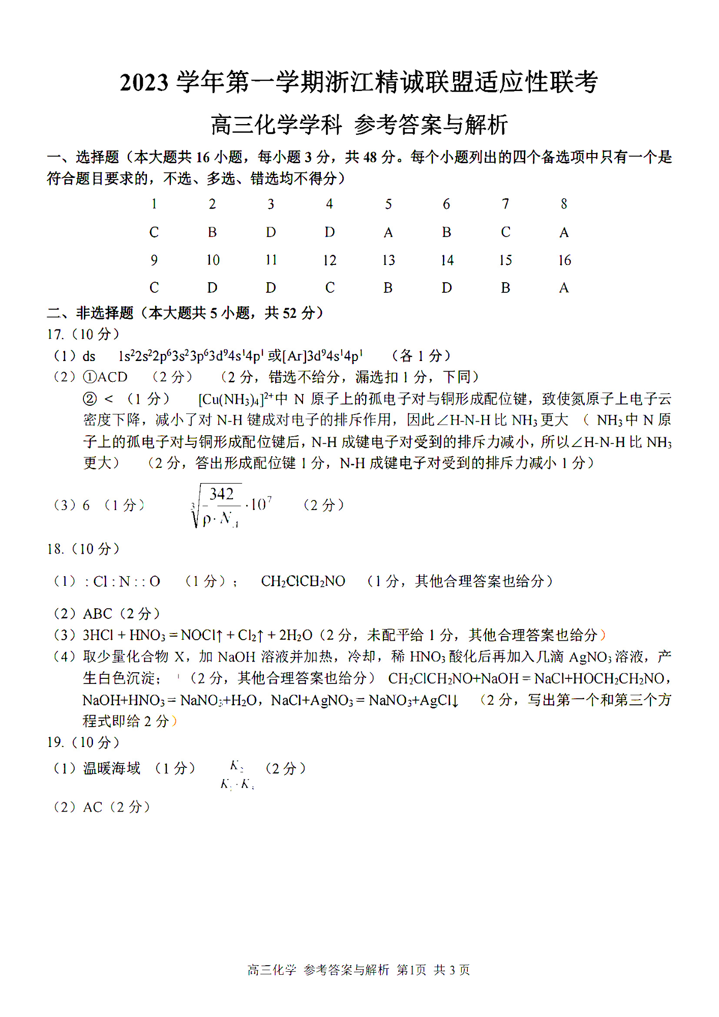 2023学年第一学期浙江省精诚联盟高三适应性12月联考 化学答案