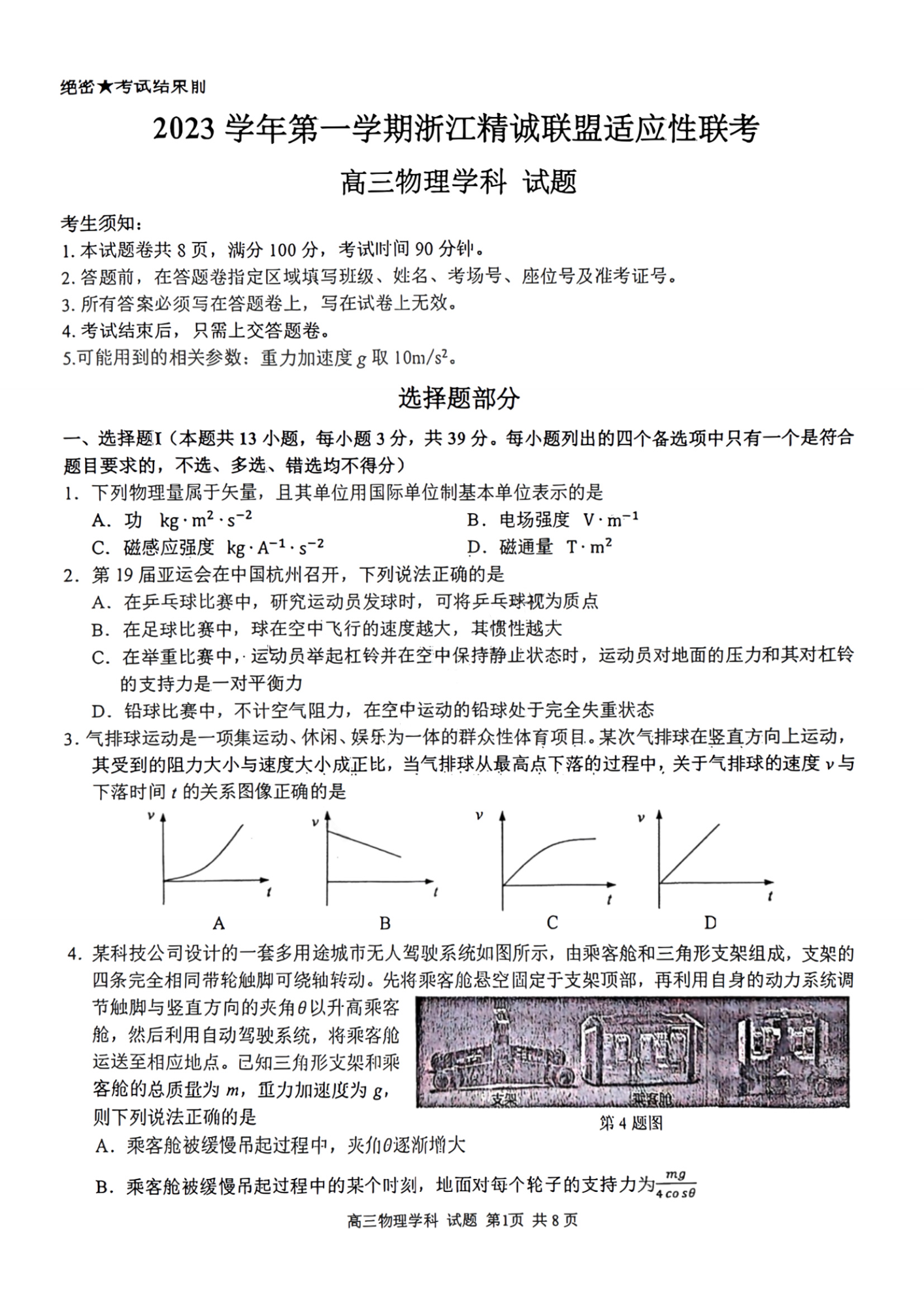 2023学年第一学期浙江省精诚联盟高三适应性12月联考 物理