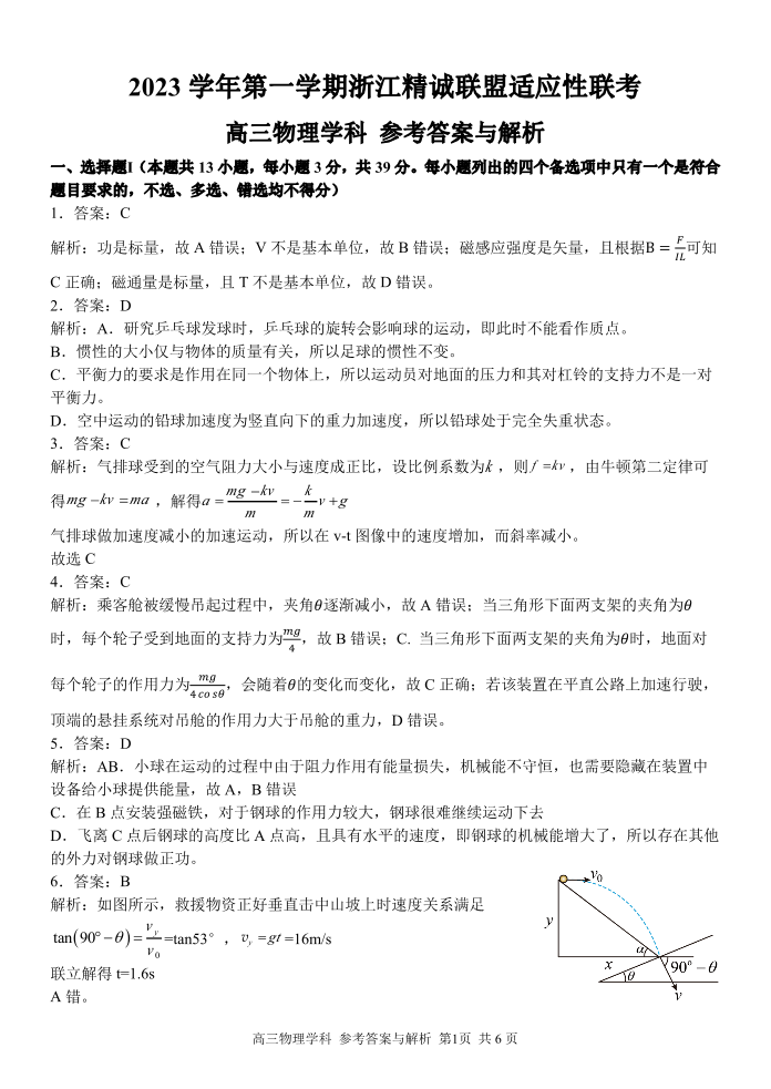 2023学年第一学期浙江省精诚联盟高三适应性12月联考 物理答案