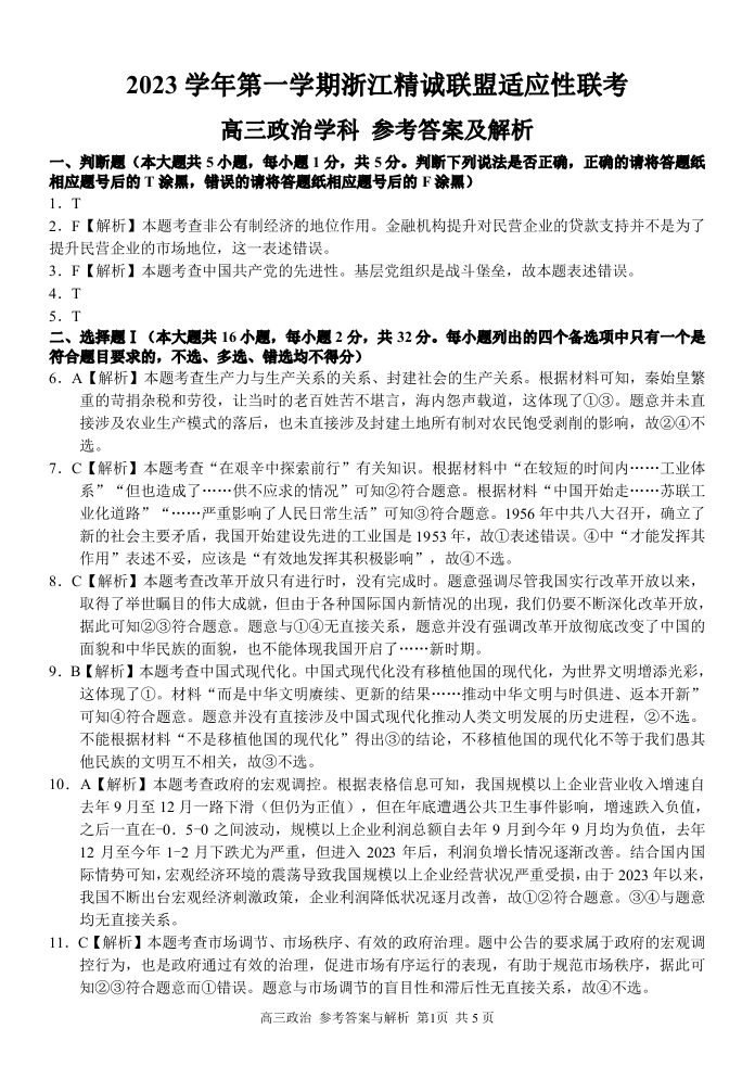 2023学年第一学期浙江省精诚联盟高三适应性12月联考 政治答案