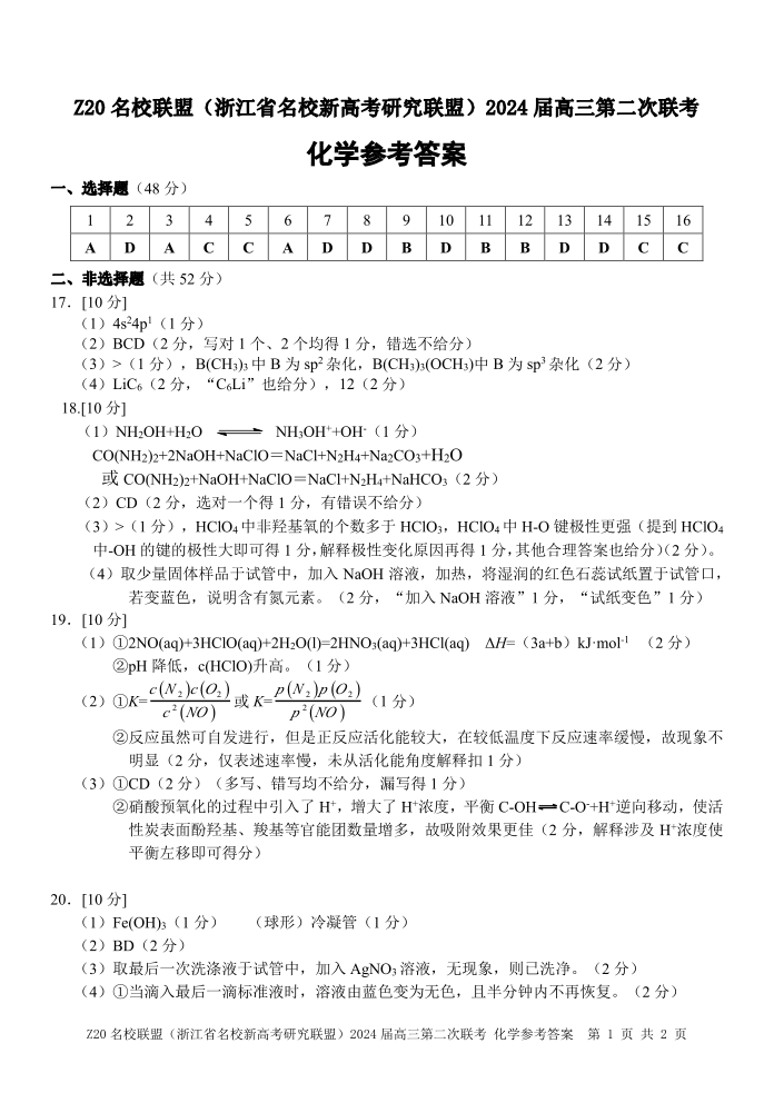 浙江省Z20名校联盟2023-2024学年高三上学期12月月考 化学答案