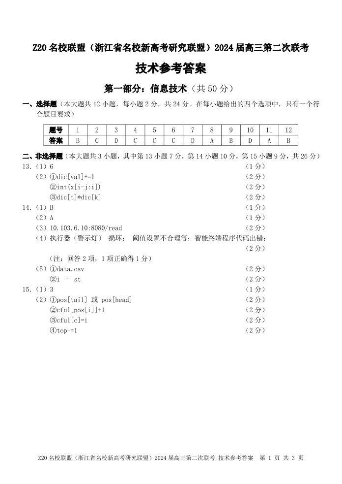 浙江省Z20名校联盟2023-2024学年高三上学期12月月考 技术答案