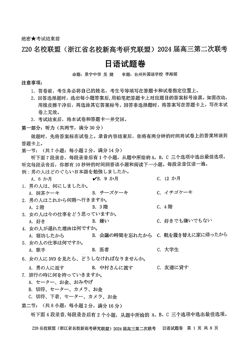 浙江省Z20名校联盟2023-2024学年高三上学期12月月考 日语