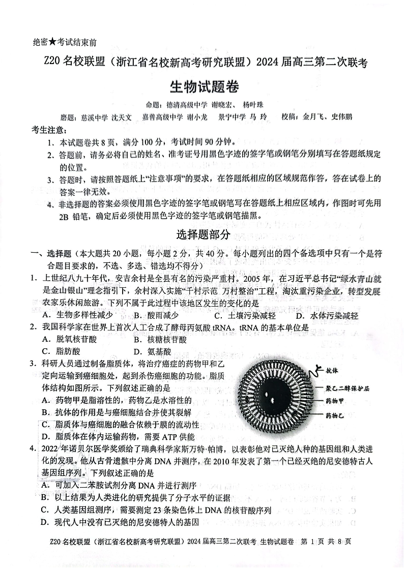 浙江省Z20名校联盟2023-2024学年高三上学期12月月考 生物
