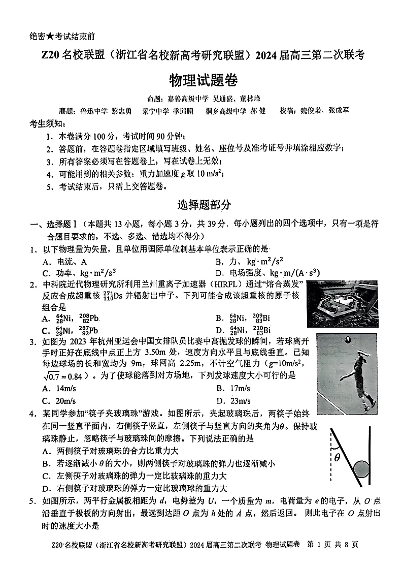 浙江省Z20名校联盟2023-2024学年高三上学期12月月考 物理