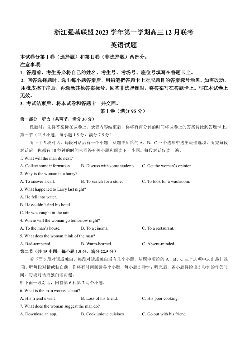 浙江强基联盟2023-2024学年第一学期高三12月联考 英语