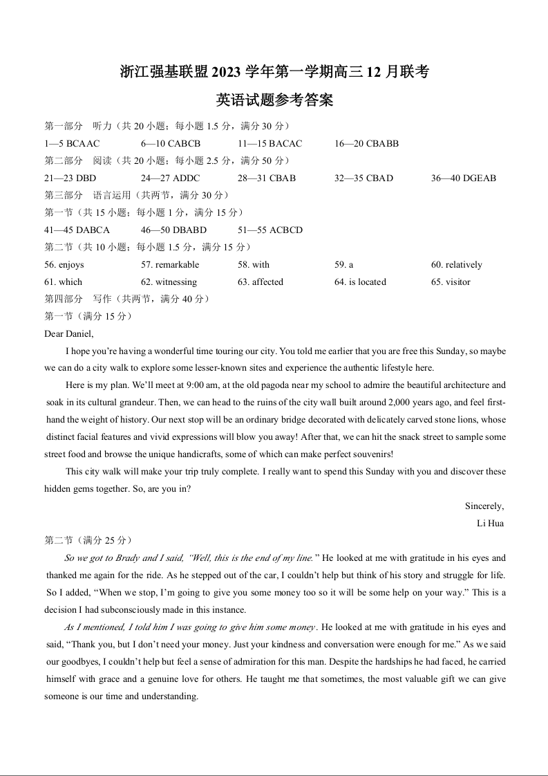 浙江强基联盟2023-2024学年第一学期高三12月联考 英语答案