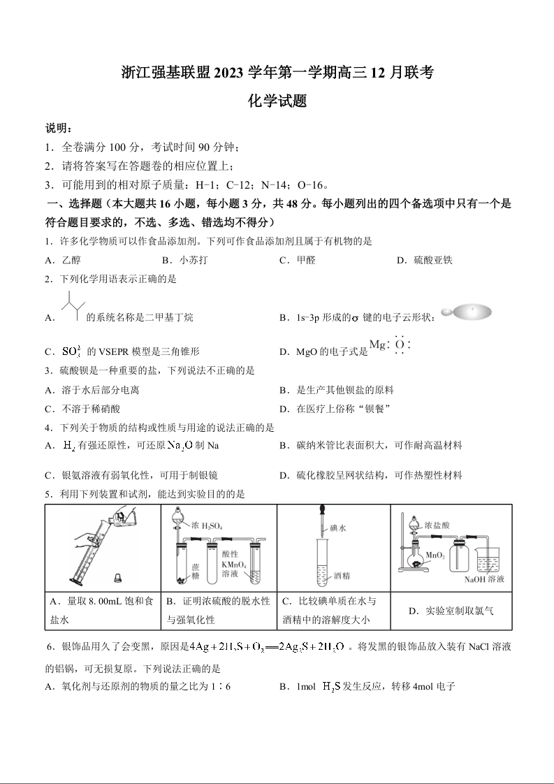 浙江强基联盟2023-2024学年第一学期高三12月联考 化学