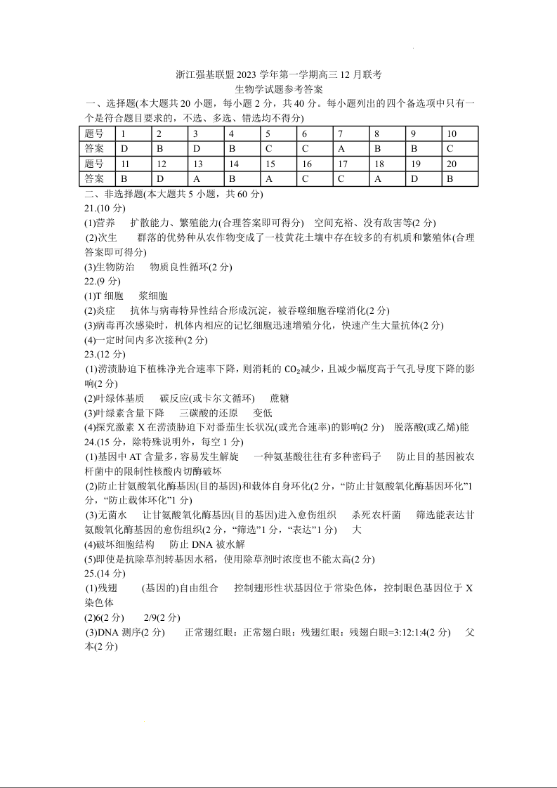 浙江强基联盟2023-2024学年第一学期高三12月联考 生物答案