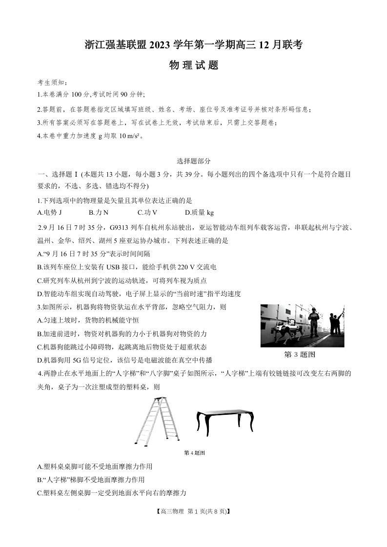 浙江强基联盟2023-2024学年第一学期高三12月联考 物理